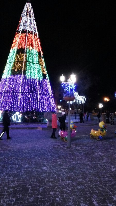 Так случилось, что на 2016-ый год елку решили, почему-то, сильно не наряжать. Так что днем главная городская красавица выглядит весьма скромно.