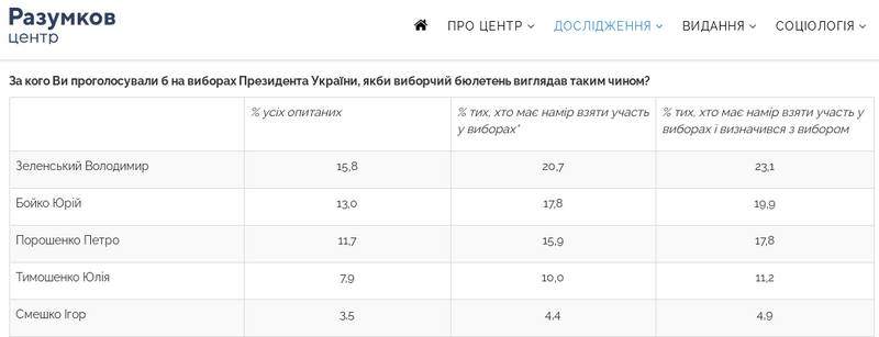 Новые рейтинги от социологов: у Зеленского 23,1%, у Бойко -19,9%, у Порошенко - 17,8%