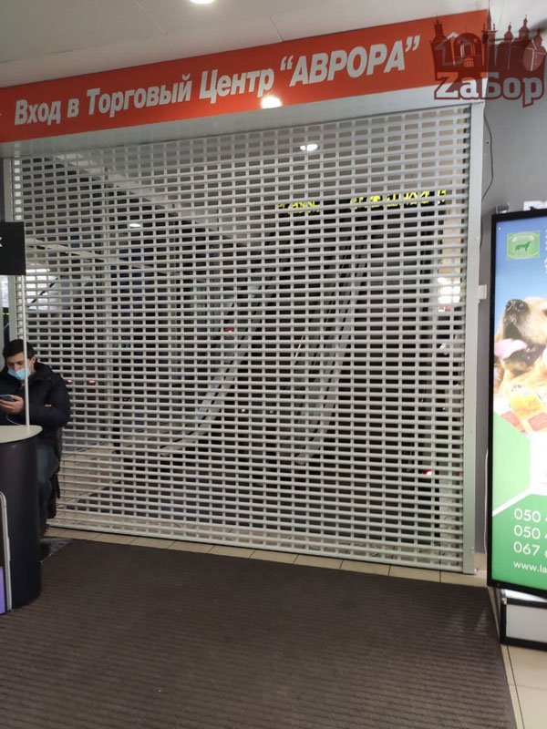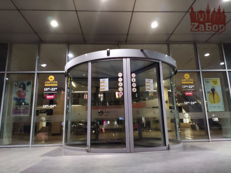 ТРЦ "Аврора". Сам торговый центр закрыт, но в подвальном помещении работает "Варус" и некоторые магазины. Таблички о запрете здесь есть не везеде.