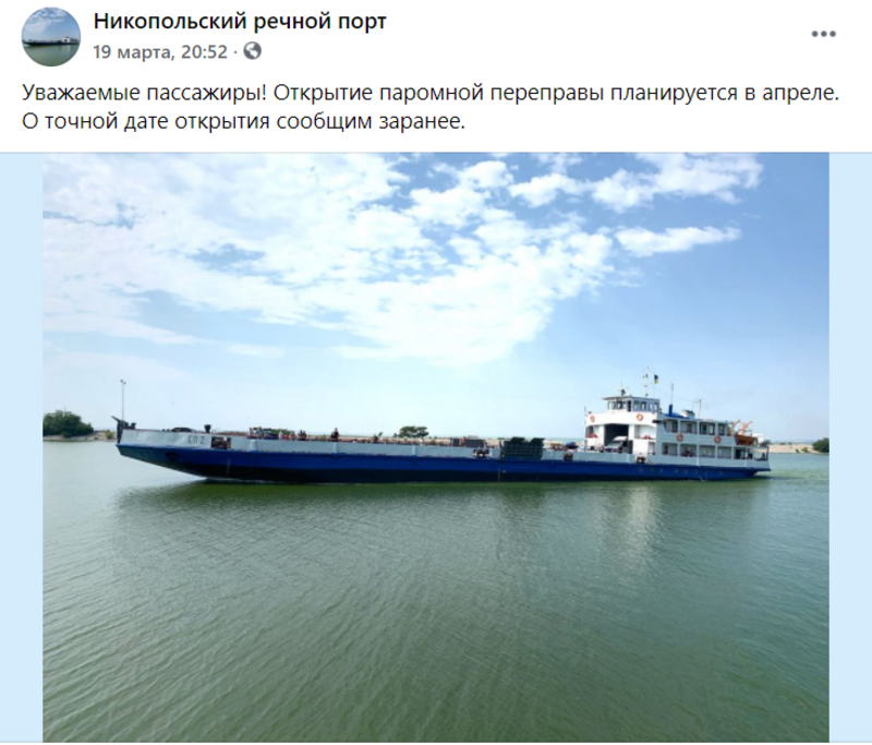 Запуск паромной переправы между городами Каменка-Днепровская и Никополь заработает в апреле этого года. Об этом сообщили в пресс-службе Никопольского речного порта и отметили, что точную дату открытия сообщат позже.
