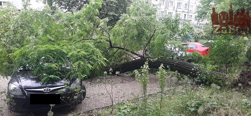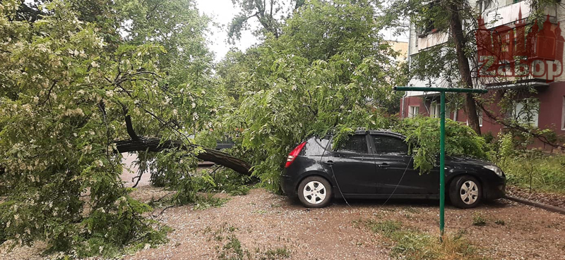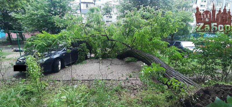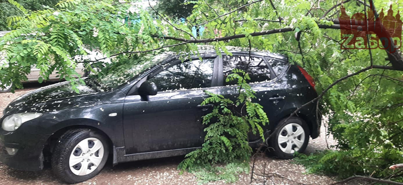 ЧП произошло в Коммунарском районе Запорожья, тут из-за непогоды, на автомобиль, упало дерево акации, сообщает "ZаБор".