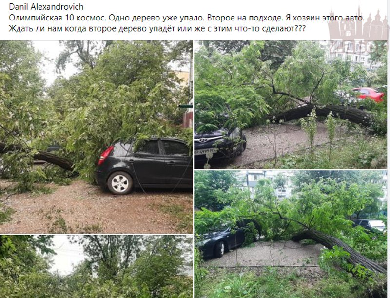Вчера, 3 июня, в соцсети Фейсбук местный житель поделился фото, как на его авто рухнуло дерево. ЧП произошло по улице Олимпийская, 10. Так, мужчина пишет, "Одно дерево уже упало. Второе на подходе". К слову, дерево вырвало с корнями, и оно упало не только на машину, но и перегородило всю дорогу.