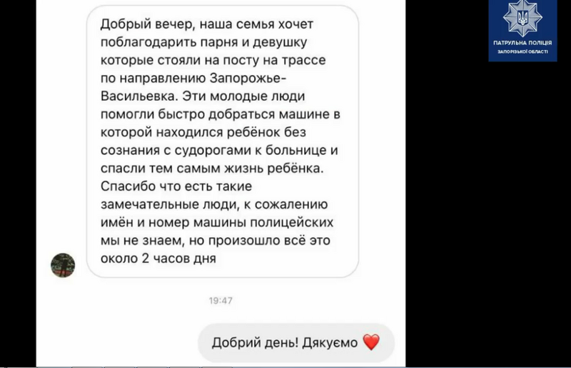 3 марта по трассе Запорожье-Васильевка к патрульным полицейским обратились родители с просьбой о помощи их 2-летнему сыну, мальчик был без сознания и с судорогами. Полицейские быстро среагировали и сопроводили родителей с ребенком в больницу, передает "ZаБор".