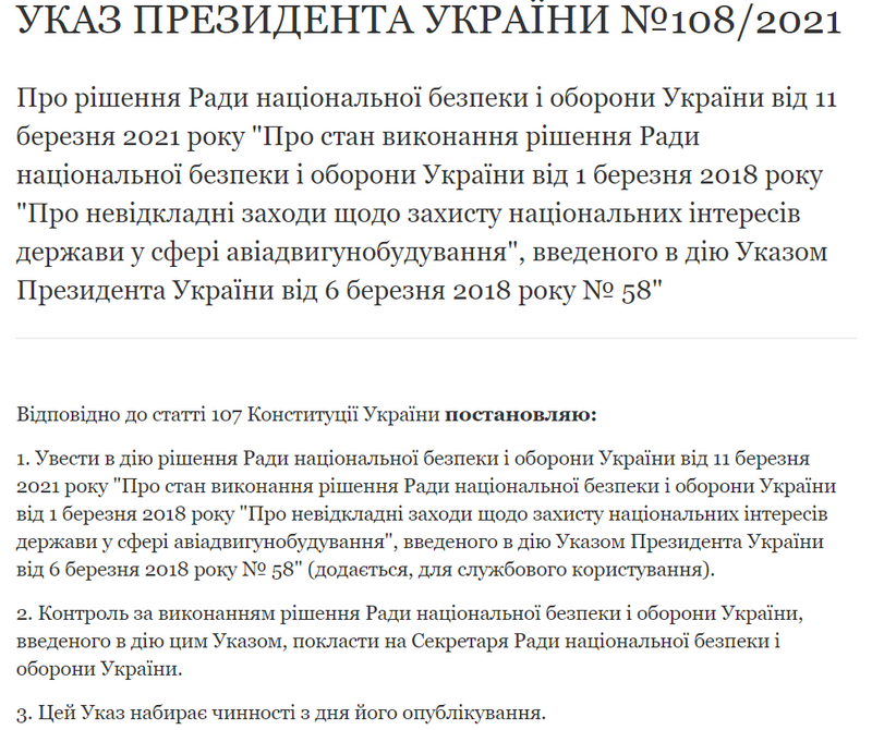 В начале марта Верховную Раду подали законопроект о национализации "Мотор Сичи". Так, на официальном сайте президента Украины появился указ №108/2021, который вводит в действие решение СНБО о возврате "Мотор Сичи" в собственность государства. В СНБО приняли соответствующее решение еще 11 марта, а указ был подписан вчера 23 марта.