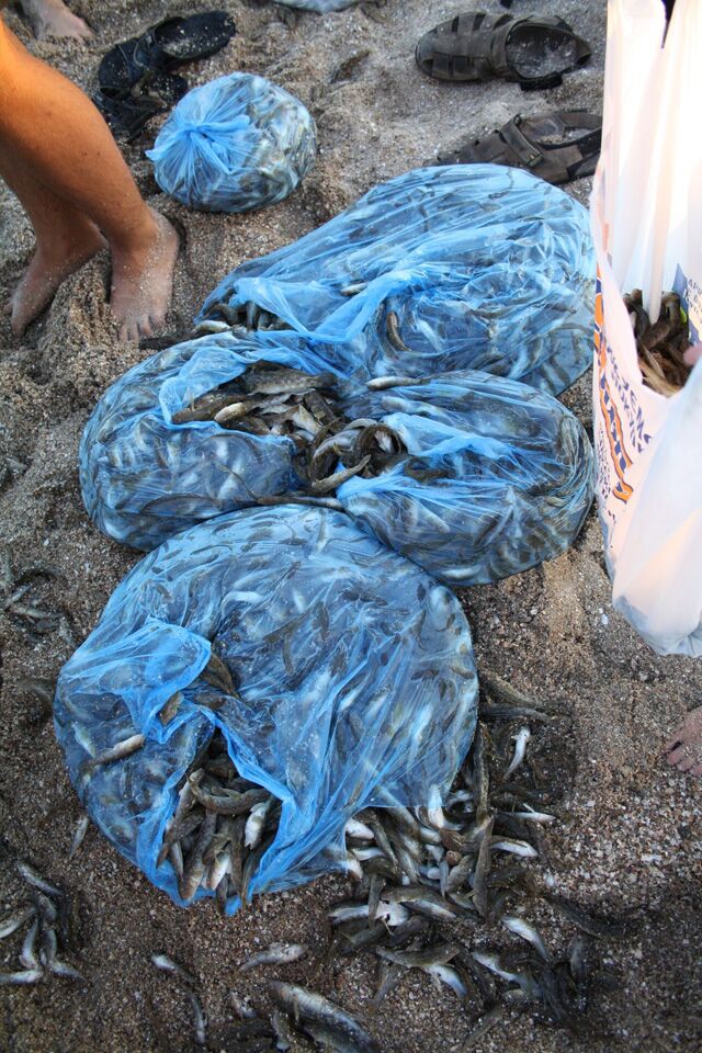 На каждый метр пляжной зоны приходится по несколько "заморенных" бычков. Это не настолько глобально, как на Бердянской Косе. "Но впечатления от отдыха мертвая рыба под ногами и перед глазами все же портит"- признаются туристы.