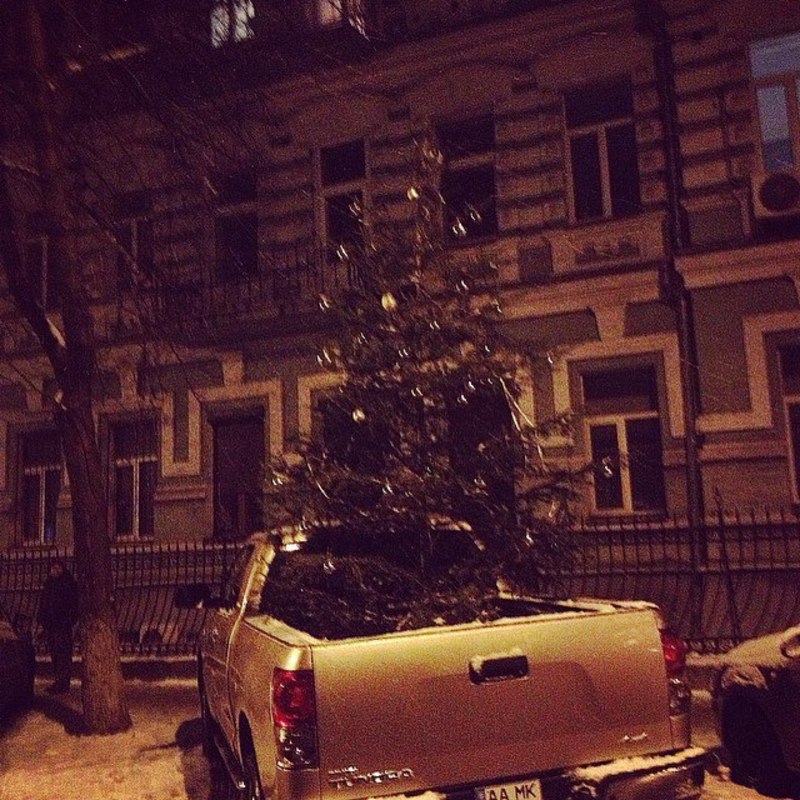 Самая мобильная елка - в Киеве. Некоторые жители Киева на столько любят новогодние праздники, что решили не расставаться с подобающим настроением и потому прямо с собой в авто возят настоящую украшенную елку.