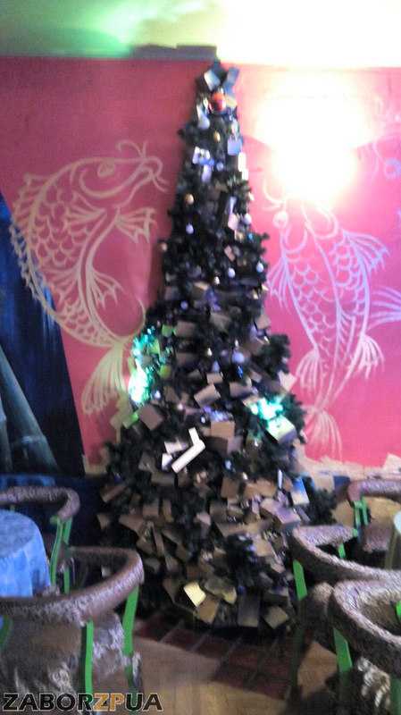 Самая наваленная елка - в Запорожье. Так, один из ресторанов ("4 Стихии") пытается радовать своих посетителей елкой, украшенной деревянными брусками и бумагой.
