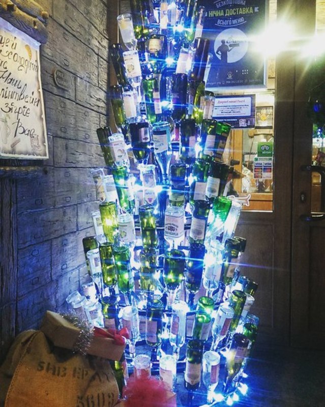 Самая алкогольная елка - в Тернополе. Так, тернопольский бар встречает своих посетителей максимально тематической елочкой.