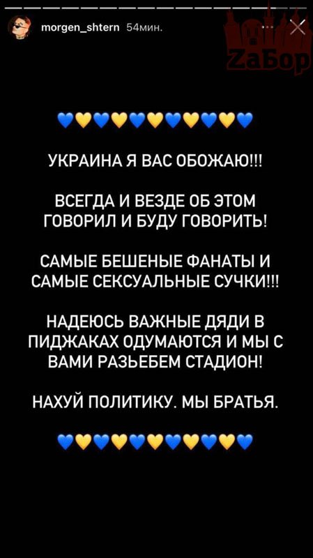 Так, на своей странице в соцсети Моргенштерн отреагировал на такое решение. Артист написал, что любит Украину и надеется, что "важные дяди в пиджаках одумаются" и он еще выступит в Украине. Также он написал, что все мы братья.