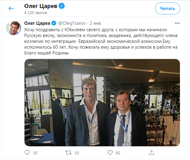 Так, в твиттере Олег Царев опубликовал пост о том, что поздравляет своего друга, с которым начинали "русскую весну". Под постом он опубликовал фото с Сергеем Глазьевым.