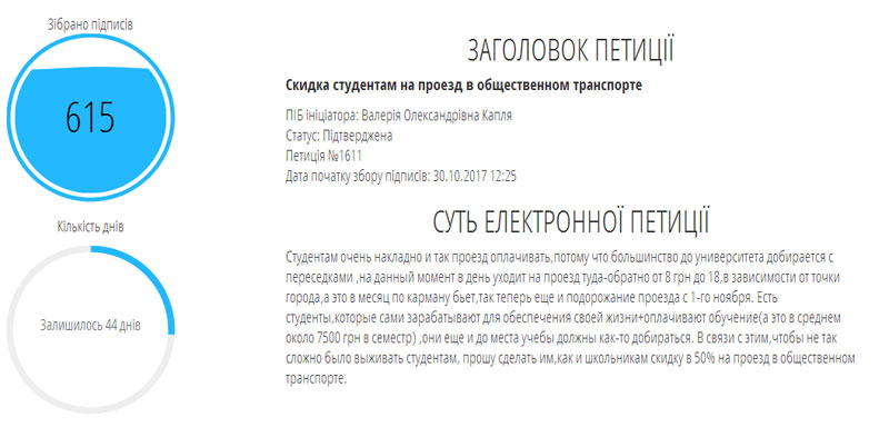 Студенты жалуются, что многим приходится ездить с пересадками и на проезд уходит от 8 до 18 гривен в день. С увеличением стоимости проезда, эта сумма также возросла. Поэтому студенты просят войти в их положение и помочь сделать для них проезд в половину дешевле.