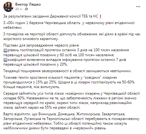 Также, Виктор Ляшко отметил, что с 1 марта 00 часов Черновицкая область будет находиться на красном уровне эпидемической опасности.