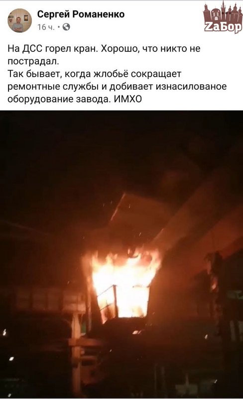 Об этом рассказал Сергей Романеко в соцсети Фейсбук. Он отмечает, что такое происходит, когда сокращают ремонтные службы и добивают "изнасилованное" оборудование завода.