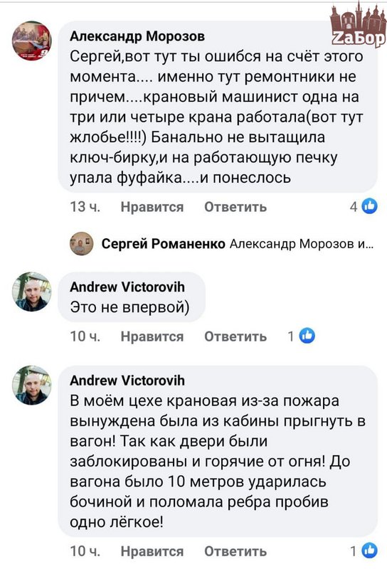 Причем в комментариях пишу о том, что тут ремонтники не виноваты, такое может произойти и по вине самого машиниста. Как рассказывают в комментариях: "именно тут ремонтники не причем....крановый машинист одна на три или четыре крана работала(вот тут жлобье!!!!) Банально не вытащила ключ-бирку,и на работающую печку упала фуфайка....и понеслось".