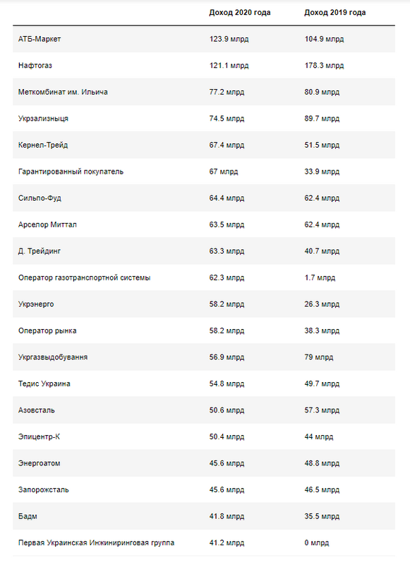 А вот суммарный доход первой десятки крупнейших компаний сокращается уже не первый год. В 2020 году он составил 784 млрд грн, что на 9% меньше, чем в 2019 году, тогда суммарный доход упал на 11%. Основной причиной называют – реструктуризация "Нафтогаза" и снижение выручки у металлургов.