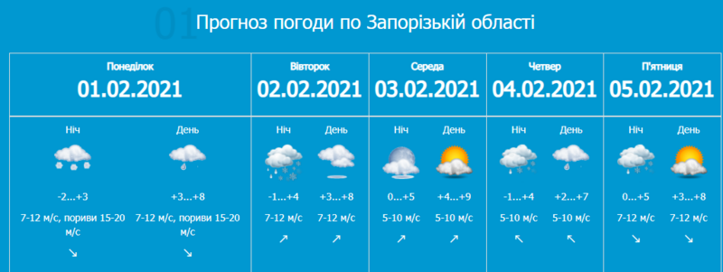 1 февраля в Запорожской области синоптики прогнозируют снег, дождь и порывы северо-западного ветра 15-20 м/с. Об этом сообщают в "Гидрометцинтре".