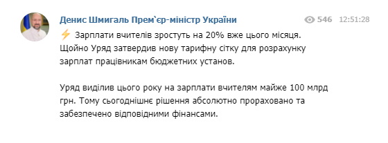 20 января во время заседания Правительства Украины, было принято решение повысить зарплаты учителям на 20%. Денис Шмигаль рассказал об этом в своем телеграм-канале. Он отметил, что уже в январе сотрудники сферы образования получат зарплаты, которые увеличатся на 20%.