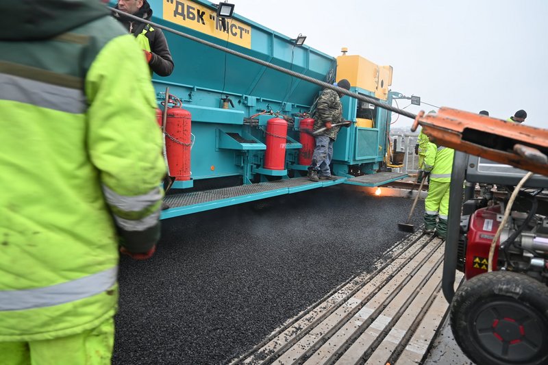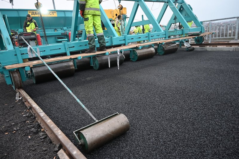 Так, рабочие уже обработанные поверхности проезжей части моста, продолжают покрывать гусасфальтом. Это водонепроницаемый и гибкий материал. Эти его свойства особенно приемлемы для строительства мостов.