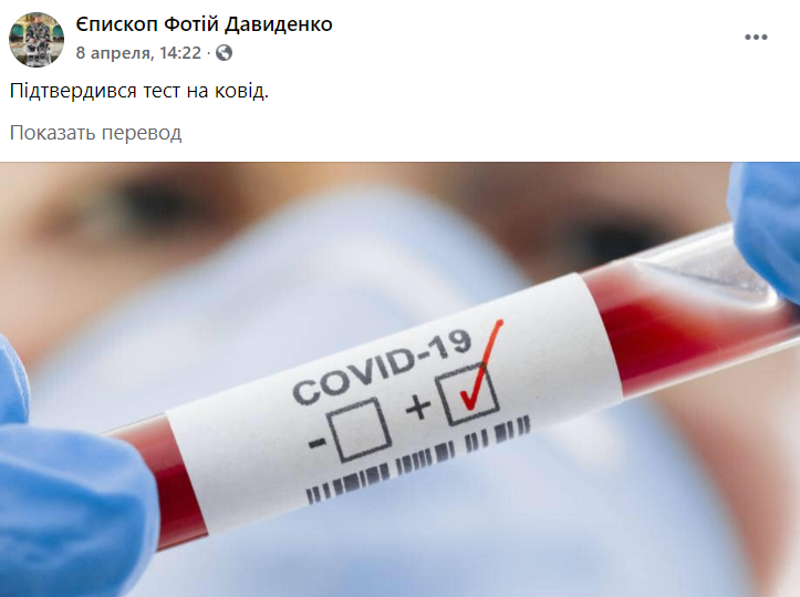 Епископ Фотий Давиденко заболел коронавирусной инфекцией. Об этом он рассказал на своей странице Фейсбук, передает "ZаБор".