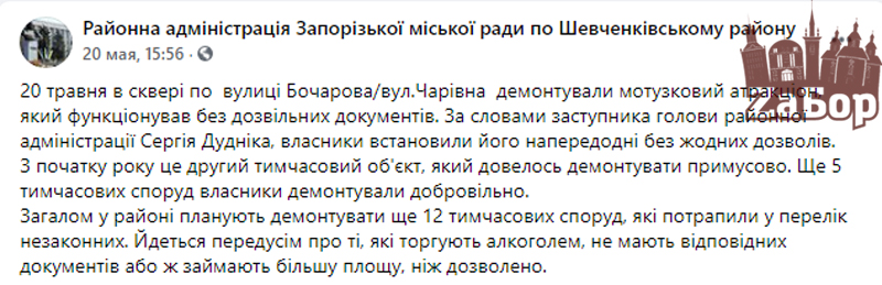 В апреле в Шевченковском районе Запорожья установили еще один веревочный парк. Однако, аттракцион пришлось демонтировать поскольку он функционировал без советующих документов, передает "ZаБор".