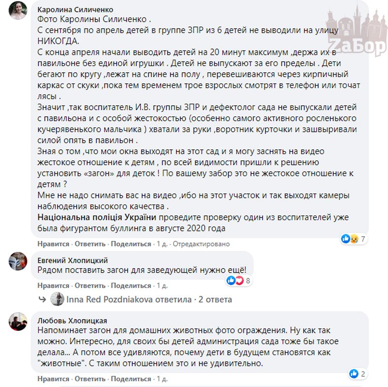 Кроме этого, женщина пишет, что воспитатель группы ЗПР и дефектолог сада не выпускали детей из павильона. Они хватали их за руки, воротник курточки и "зашвыривали силой опять в павильон". Также Каролина пишет: "Зная о том ,что мои окна выходят на этот сад и я могу заснять на видео жестокое отношение к детям , по всей видимости пришли к решению установить "загон" для деток ! По вашему забор это не жестокое отношение к детям".