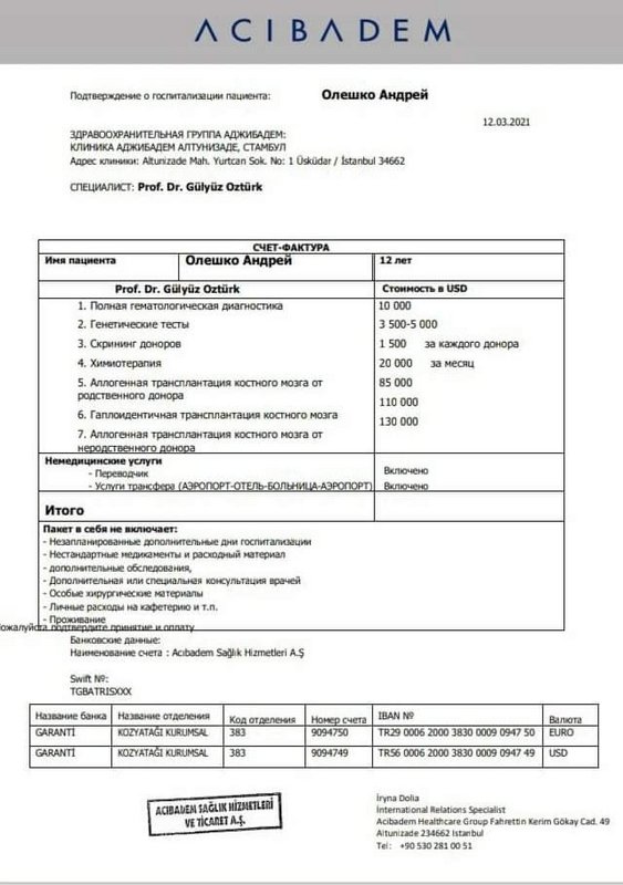 Врачи не исключают, что Андрею понадобиться трансплантация костного мозга. На данный момент ищут доноров 4 группы крови.