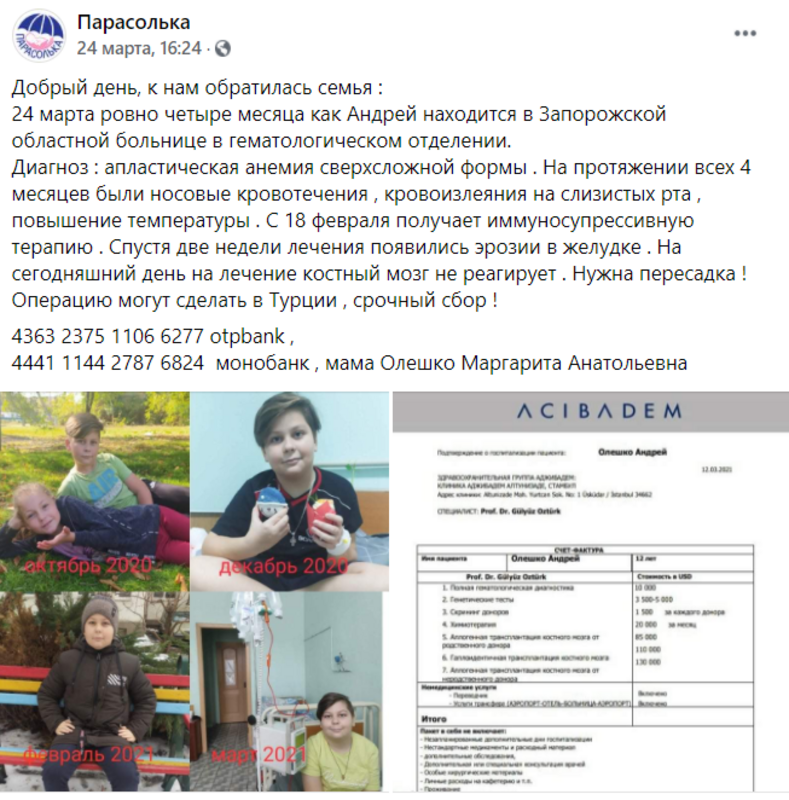 В конце ноября 2020 года Андрей Олешко попал в Запорожскую областную больницу в гематологическое отделение. С того момента ребенок до сих пор не может побороть болезнь.