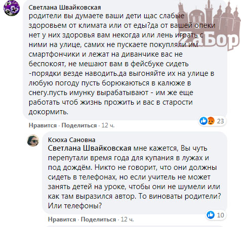 А вот в комментариях мнение по этому поводу разделились. Так, одни начали говорить о том, что на улице была плюсовая температура, а не мороз. У детей есть телефоны и они могли позвонить родителям. Также, говорят о том, что сейчас дети слабые из-за того, что они мало времени проводят на улице, из-за того, что родителям некогда с ними играть на улице и они "покупляли им смартфончики и лежат на диванчике вас не беспокоят", а так пускай на улице в любую погоду "борюкаются" в лужах и снегу, чтобы была крепкая иммунная система.