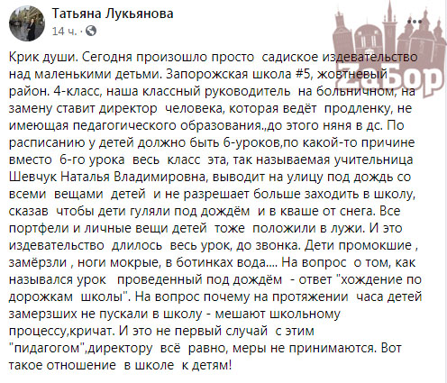 В Запорожье для учеников 4 класса учитель продленки провела странный урок под дождем
