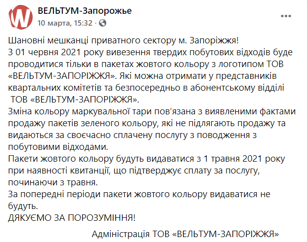 С 1 июня 2021 года вывозить твердые бытовые отходы будут только в пакетах желтого цвета с логотипом "ВЕЛЬТУМ-Запорожье". Так, новые пакеты жители смогут получить у представителей квартальных комитетов или непосредственно в абонентском отделении "ВЕЛЬТУМ-Запорожье".