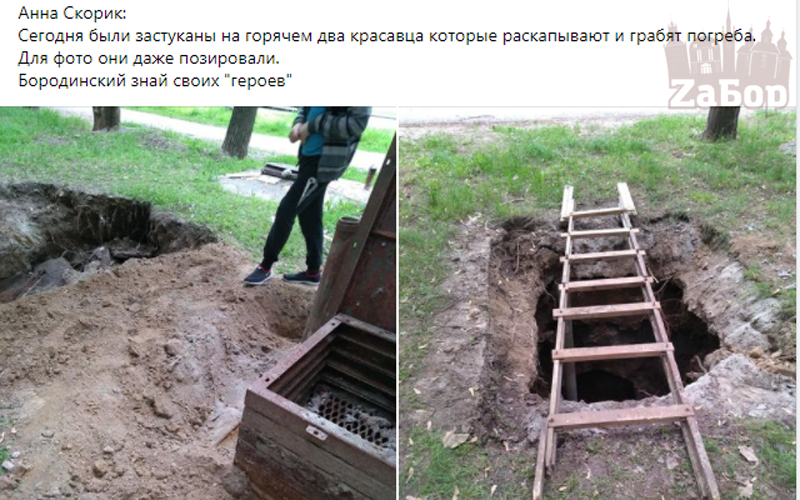 Постом в соцсети поделилась запорожанка Анна Скорик. Женщина рассказала, что 22 мая на горячем были "застуканы" двое мужчин. Так, они раскапывали и грабили погреба местных жителей. Когда их стали фотографировать, то они даже не закрывали лица. Так, на фото они стоят с лопатой, молотком и ломом. А возле раскопанных погребов лежит лестница.