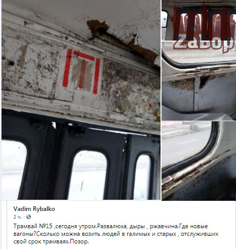 Местный житель опубликовал пост, в котором показал ужасное состояние трамвая№15.Так, в трамвае дыры и ржавчина, потолок провисает, а краска облущивается. В комментариях пишут, что похожая ситуация и с трамваем №10.