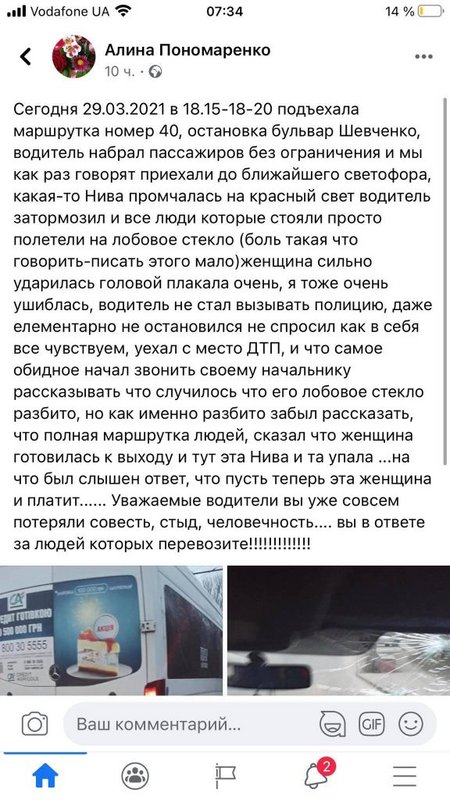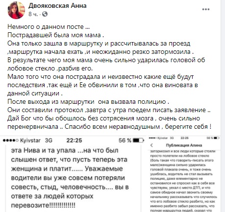Позже появился пост от дочери пострадавшей. Она рассказала, что женщина только зашла в маршрутку и стала рассчитываться. Тут маршрутка начала ехать, а потом резко затормозила, в результате чего женщина сильно ударилась головой об лобовое стекло и разбила его. Как уже известно водитель обвинил ее в испорченном стекле. После того, как женщина вышла из маршрутки, она вызвала полицию и те составили протокол. Далее пострадавшая будет писать заявление.