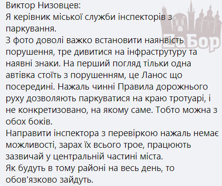 На данную ситуацию ответил руководитель областной службы инспекторов по парковке Виктор Низовцев. Так, он написал, что по фотографии очень трудно установить есть нарушение или нет, нужно смотреть на инфраструктуру и имеющиеся знаки. Также он отметил, что на первый взгляд только одна машина стоит с нарушениями, и заявил, что действующие правила дорожного движения разрешают парковаться на краю тротуара, при этом не указано на каком именно.