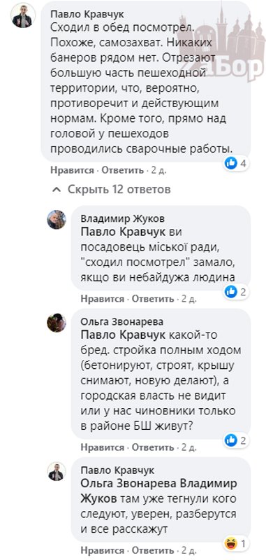 Появился по поводу данной стройки и пост в Фейсбук, в котором просят объяснить, что тут происходит. В комментариях под постом чиновник Павел Кравчук отметил следующее: "Сходил в обед посмотрел. Похоже, самозахват. Никаких баннеров рядом нет. Отрезают большую часть пешеходной территории, что, вероятно, противоречит и действующим нормам. Кроме того, прямо над головой у пешеходов проводились сварочные работы".