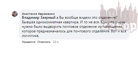 Также, пишут и о том, что данное отделение почты это бывшая однокомнатная квартира, "Вы вообще видели это отделение? Бывшая однокомнатная квартира. И то не вся. Кому-то очень нужно было выдворить почтовое отделение из помещения, которое предназначалось для почтового отделения. Вот и вся логистика".
