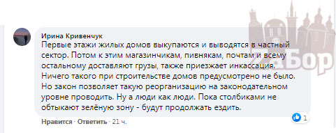 Другие же, отмечают, что первые этажи жилых домов выкупаются и выводятся в частный сектор. Потом к магазинам, почтам и прочему доставляют грузы, а изначально при строительстве домов такого предусмотрено не было. "Первые этажи жилых домов выкупаются и выводятся в частный сектор. Потом к этим магазинчикам, пивнякам, почтам и всему остальному доставляют грузы, также приезжает инкассация. Ничего такого при строительстве домов предусмотрено не было. Но закон позволяет такую реорганизацию на законодательном уровне проводить. Ну а люди как люди. Пока столбиками не обтыкают зелёную зону - будут продолжать ездить".
