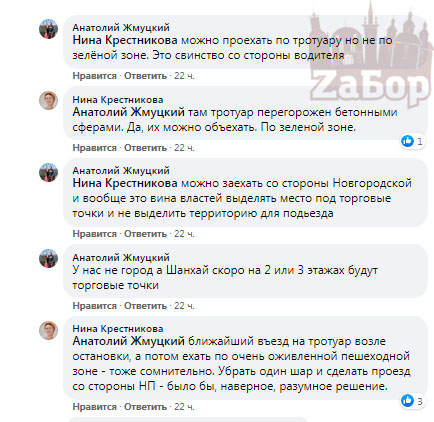 На это в свою очередь пользователи пишут, что тротуар перегорожен бетонными сферами, объехать их можно по зеленой зоне. Также отмечают, что ближайший въезд на тротуар находится возле остановки, а потом ехать по пешеходной зоне тоже сомнительно "ближайший въезд на тротуар возле остановки, а потом ехать по очень оживленной пешеходной зоне - тоже сомнительно. Убрать один шар и сделать проезд со стороны НП - было бы, наверное, разумное решение".