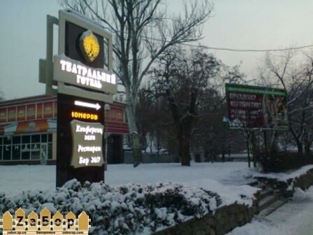 Билборд гостиницы "Reikartz" располагается напротив входа в гостиницу "Театральную" и сбоку от рекламы этой же гостиницы.