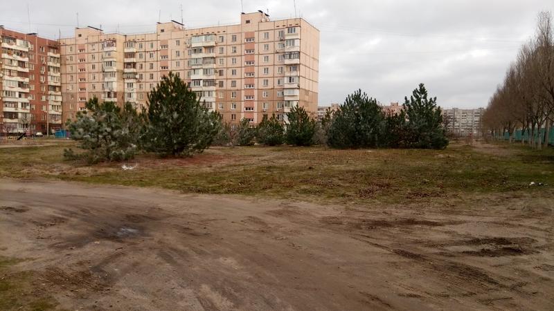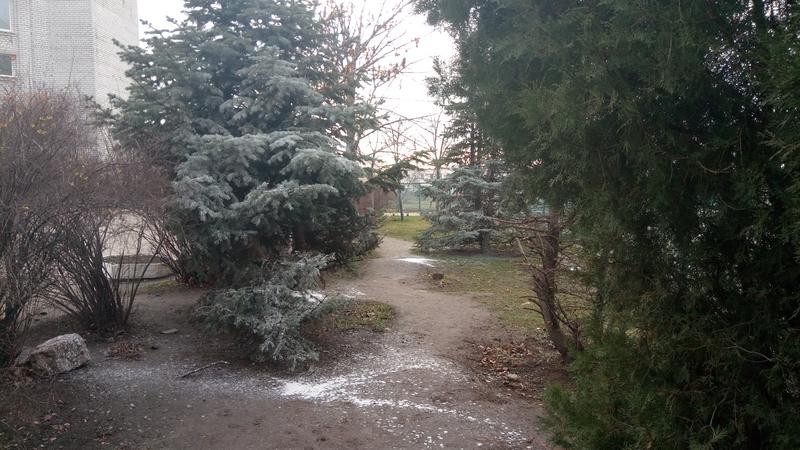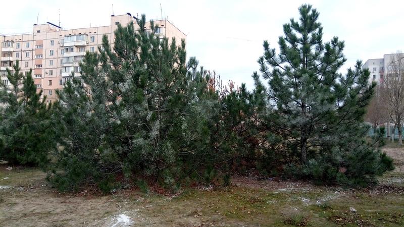 Первые крашеные в белый цвет елки и сосны, замечены сегодня, 12 декабря, на территории гимназии №107 и на прилегающей к ней территории.