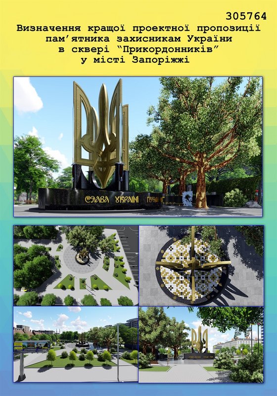 В феврале в департаменте архитектуры и градостроительства Запорожского городского совета подвели итоги проведения открытого архитектурного конкурса на определение лучшего проектного предложения памятника защитникам Украины. Так, победителем стал проект №305764 – сдвоенный трезубец. Он содержит в себе мечи, как символ воинов Украины всех времен, и казацкий крест как символ запорожского казачества. Основу трезубца украшает вышитый орнамент.