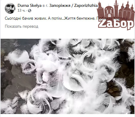 21 февраля в соцсети Александр Шкаликов опубликовал пост о том, что в урочище Сагайдачного (район улицы Малой) он обнаружил мертвого лебедя. Запорожец отмечает, что еще утром птиц видел живыми. "Сьогодні бачив живих. А потім...Життя бентежне. Поблизу Хортиці", - пишет мужчина.