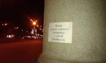 Вчера вечером, 3 апреля, в центре Запорожья появились листовки в поддержку Санкт-Петербурга, где днем в метро прогремел взрыв. Трагедия унесла жизни 14 человек.