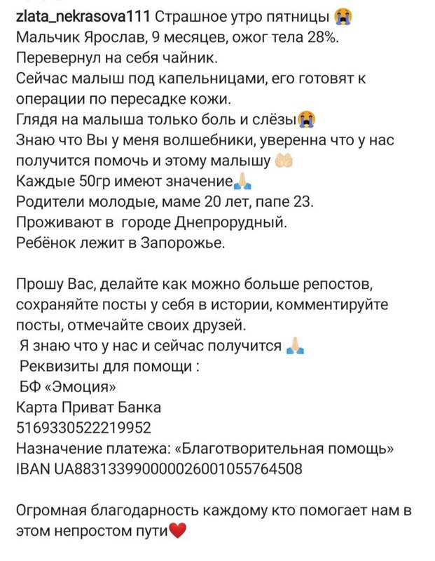 Так, в пятницу, 21 августа, 9-месячный мальчик Ярослав получил 28% ожогов тела, опрокинув на себя чайник с кипятком. Сейчас малыш находится под капельницами, его готовят к операции по пересадке кожи. Об этом на своей странице в соцсети сообщает основательница благотворительного фонда Злата Некрасова.