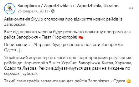 Так, с первого июня будет начата полетная программа для рейса Запорожье – Тиват (Черногория).