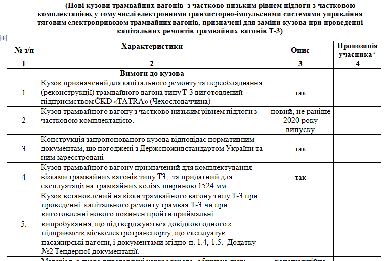 Так, кузова трамвайных вагонов должны быть не ранее чем 2020 года выпуска, с частично низким уровнем пола и электронным транзисторно-импульсными системами управления тяговым электроприводом. Сам кузов должен быть рассчитан минимум на 26 мест для сидения и приспособлен под вклеивание окон.