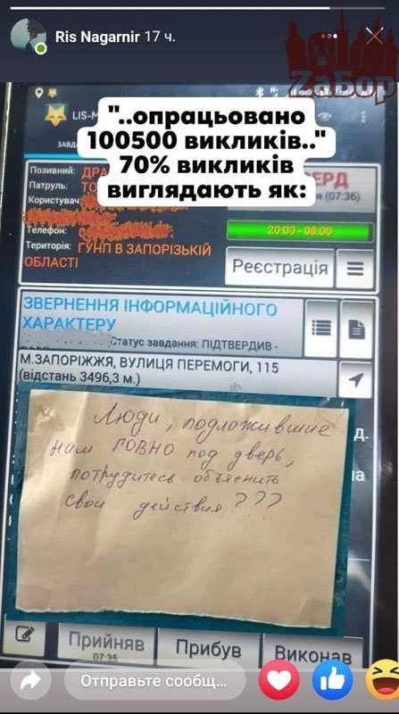 Патрульный полицейский Александр Буханец показал, как выглядит большая часть вызовов патрульных. Так, к служебному планшету он прикрепил бумажку с интересной запиской, сообщает "ZаБор".