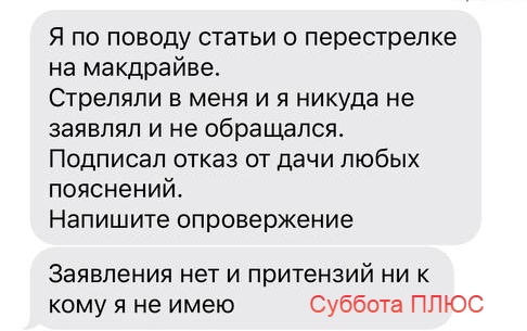 При этом, "Суббота+" сообщает, что 23 мая к ним обратился мужчина в которого стреляли и заявил, что он никуда не обращался и не заявлял. Также он написал отказ от дачи любых показаний. Кроме этого, он отмечает, что претензий он ни к кому не имеет.