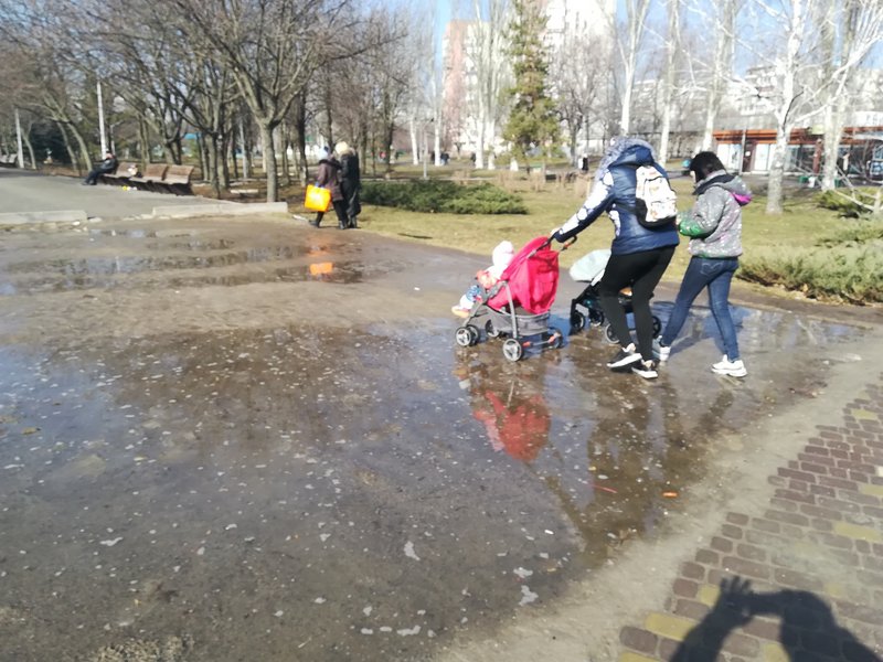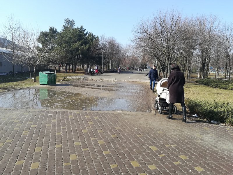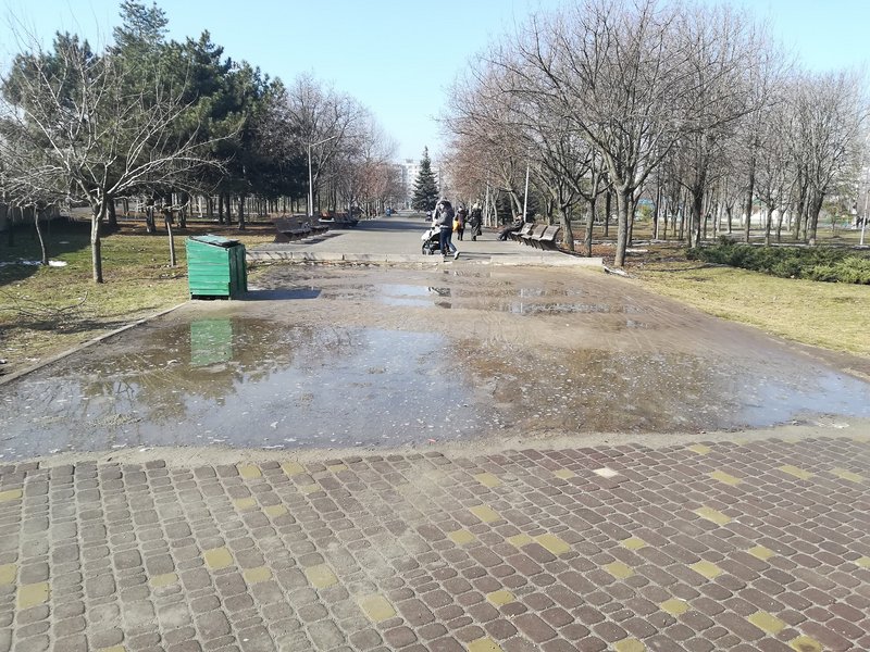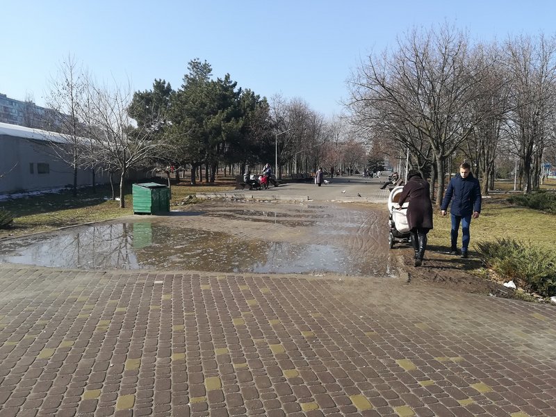 Из-за дождей и таянья снега в одном из парков Хортицкого района Запорожья прямо на тротуаре появляются огромные лужи, а местным жителям приходится идти по грязи. Новые тротуары уже разбиты, при том, что реконструкция парка уже проходила при мэрстве Владимира Буряка, передает "ZаБор".