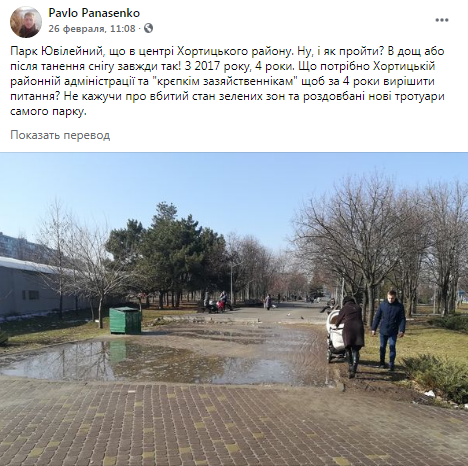На своей странице в соцсети Павел Панасенко опубликовал пост о том, что в парке Юбилейном, который находится в Хортицком районе Запорожья из-за дождей и таянья снега образовались большие лужи и грязь. Так, автор поста отмечает, что такое происходит уже 4 года. С 2017 районная администрация не предпринимает никаких мер.